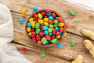 İçindekiler : Sütlü çikolata ve sütlü kokolin (%45)[şeker, kakao yağı, bitkisel yağ (palm), tam yağlı süttozu ,peyniraltı suyu tozu (süt ürünü), kakao kitlesi, kakao yağı, yağsız süttozu (süt ürünü),emülgatör (ayçiçek lesitini,amonyum fosfatid,poligliserol polirisinolet, soya lesitini (soya ürünü),aroma vericiler (süt, vanilin,çikolata)], şeker kaplama (%34) [ şeker, nişasta, kalsiyum karbonat, renklendiriciler (ponceu 4r, brillant blue, sunset yellow, tartrazin, amonyum sülfit karamel, allura red), yerfıstığı (%20), parlatıcılar (gum arabic, karnauba mumu), tuz , buğday unu (gluten)